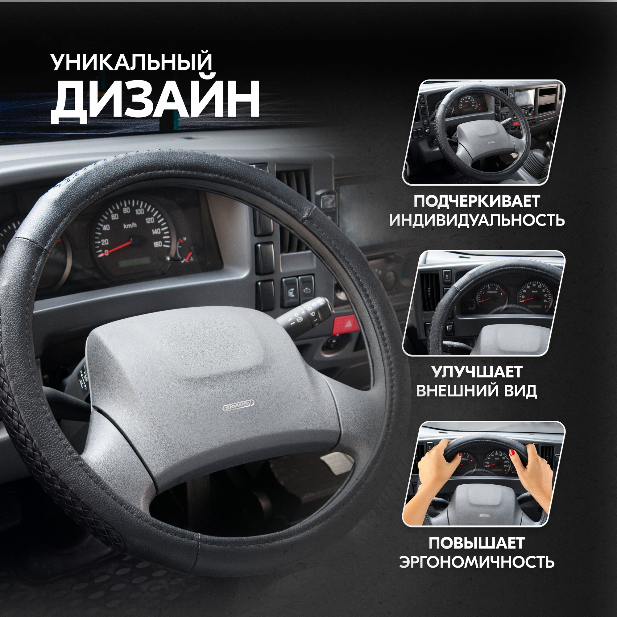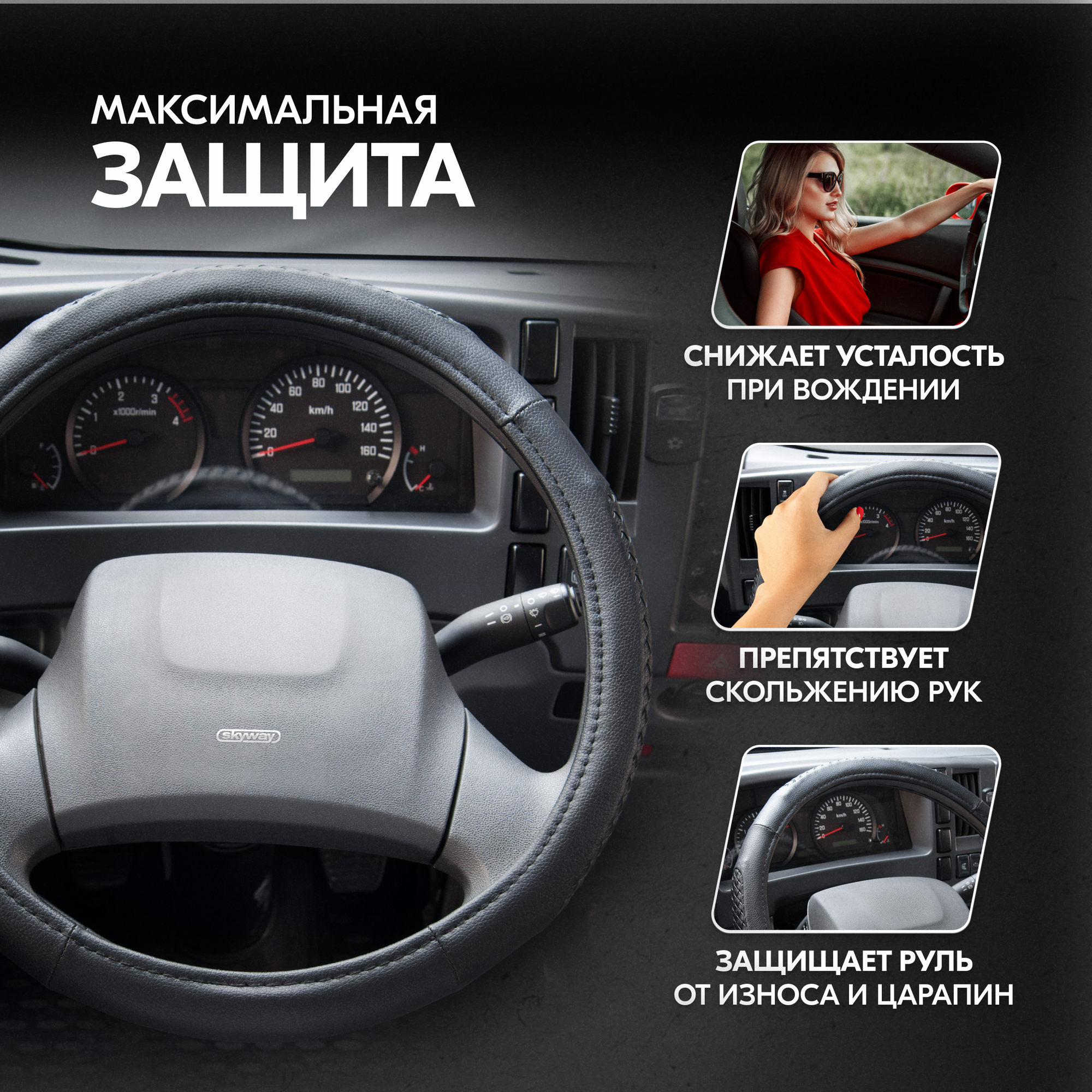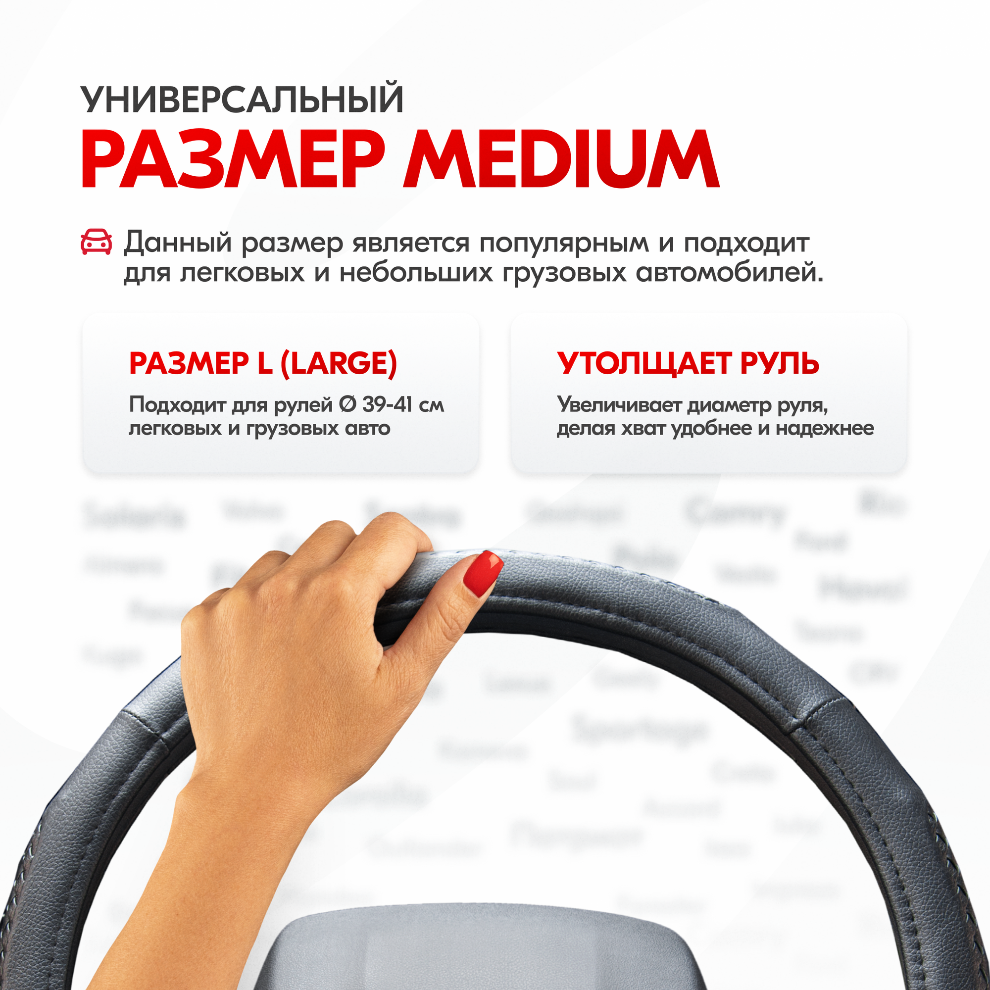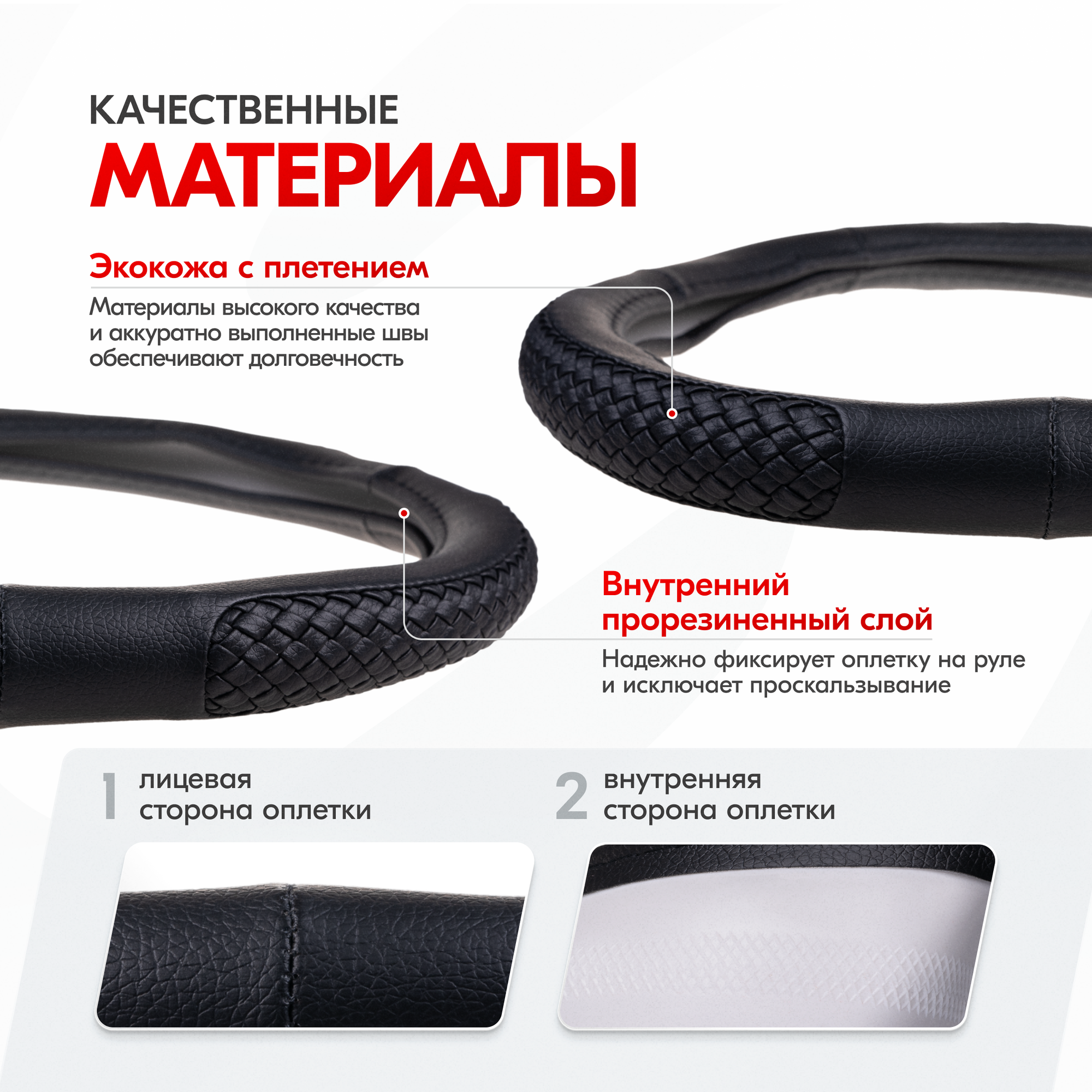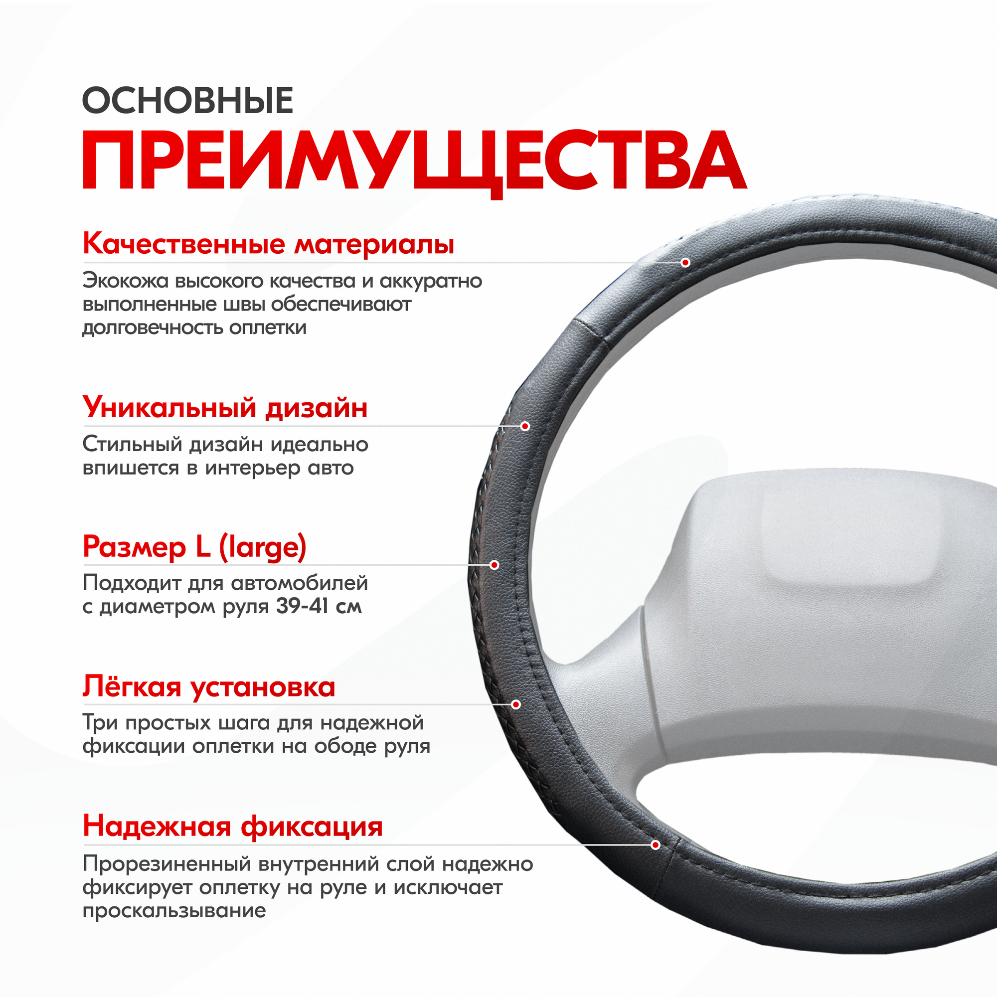 Оплетка на руль - сверхпопулярный автомобильный аксессуар. Сделана из высококачественного материала экокожа. Практичный черный цвет отлично вписывается в любой интерьер. Стильный дизайн выгодно подчеркнет хороший вкус автовладельца и его индивидуальность. Оплетка на руль Modern-6 размера «L» подходит на множество авто. Таких, как Toyota, Honda, Hyundai, Kia, ВАЗ, нива, LADA и большинство китайских автомобилей. На руль оплетка устанавливается легко, не требует долгих манипуляций, достаточно минимума усилий и предварительного нагрева для более легкого надевания. Поэтому справится даже хрупкая девушка.Внимание! Важно ознакомиться с последовательностью натягивания оплетки (см. слайд). Нагреть оплетку можно обычным феном, на солнце или горячим воздухом в машине.Тянется при установке, при этом отлично держит форму и плотно прилегает к рулю, повторяя его рельеф и изгибы. Вот почему чехол на руль автомобиля универсальный. Преимущества: износостойкая, без запаха, устойчива к царапинам и порезам.Чехол на руль с отменными рабочими характеристиками: скрывает имеющиеся потертости и царапины, уберегает от появления новых. Оплетка на руль не перегревается летом от солнечных лучей и не обжигает руки, а зимой не дубеет на морозе, не растрескивается, материал оплетки очень приятный на ощупь.За счет красивого внешнего вида чехол на руль автомобиля хорош как подарок девушке, как подарок мужчине в машину.Противоскользящий материал ПВХ с внутренней стороны гарантирует - оплетка не будет смещаться по ободу колеса, обеспечит крепкое сцепление с его поверхностью, что критично важно во время вращения руля.