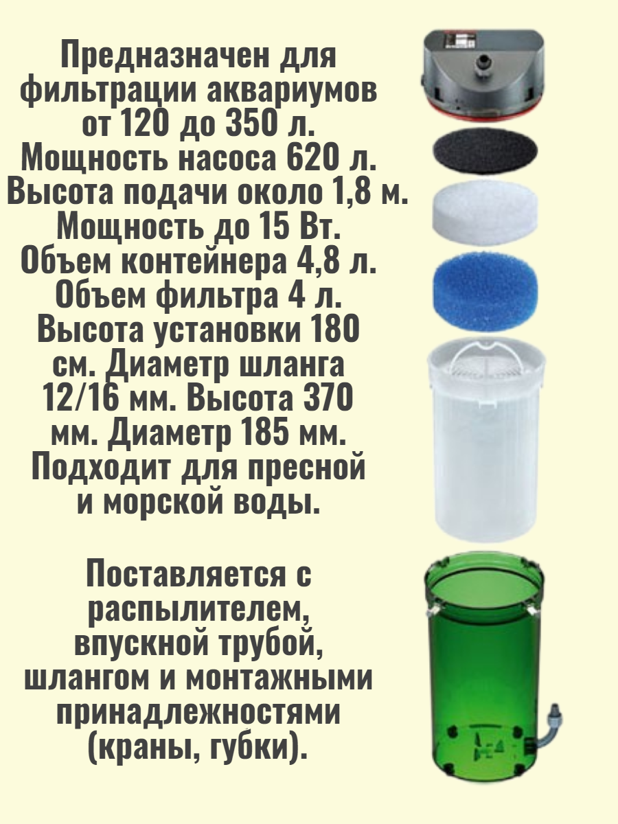 Помимо механической очистки при помощи пористых материалов, присутствует биологическая обработка воды полезными бактериями. Функционал включает в себя ручную регулировку производительности двигателя и интенсивность потока. За час такая модель может очистить до 600 литров жидкости. Требует подключения к стандартной электросети посредством комплектного кабеля. Корпус изготовлен из безопасного и прочного пластика.
