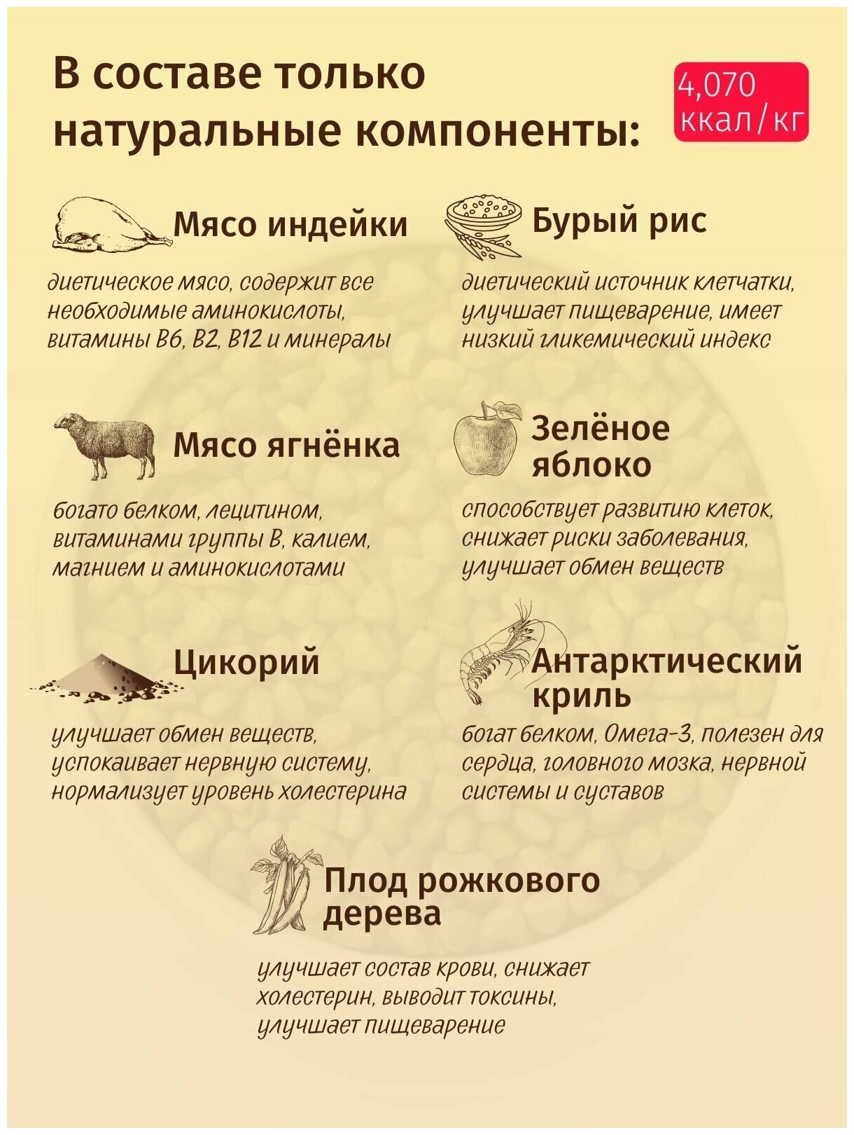 | Состав | Дегидрированное мясо ягненка, Дегидрированное мясо индейки, Цельный бурый рис, Свежее мясо ягненка, Свежее мясо индейки, Жир индейки, Экстракт цикория (естественный источник FOS и инулина), Мука из плода рожкового дерева, Сушеное яблоко, Сушеный Антарктический Криль (естественный источник EPA и DHA), Пивные дрожжи (естественный источник MOS), Юкка Шидигера, Таурин, Глюкозамин, Хондроитин, МСМ (Метилсульфонилметан), Комплекс натуральных антиоксидантов (Экстракт Розмарина, Грейпфрута, Апельсина, Куркумы и Сизигиума). Сохранено витамином С, розмарином и смесью природных токоферолов (источник натурального витамина Е). Метаболическая энергия составляет: 4,070 ккал/кг Анализ %: Протеин |