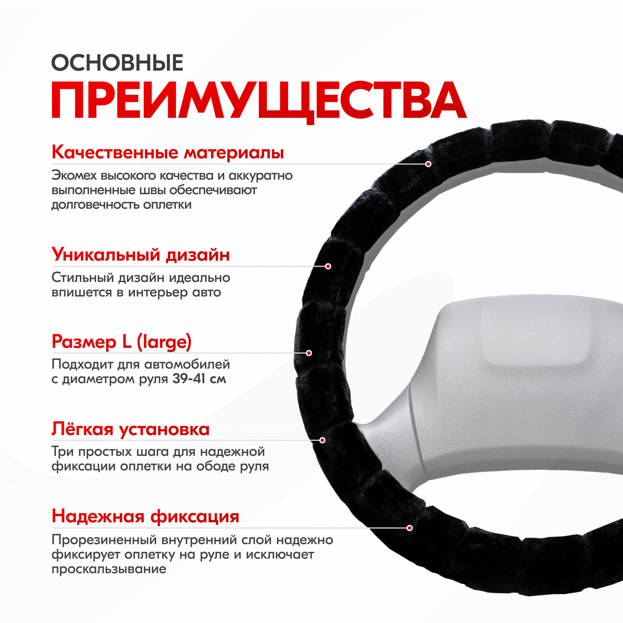 Оплетка на руль - сверхпопулярный автомобильный аксессуар. Сделана из высококачественного материала экомех. Практичный черный цвет отлично вписывается в любой интерьер. Стильный дизайн выгодно подчеркнет хороший вкус автовладельца и его индивидуальность. Оплетка на руль Arctic-1 размера «L» подходит на множество авто. Таких, как Toyota, Honda, Hyundai, Kia, ВАЗ, нива, LADA и большинство китайских автомобилей. На руль оплетка устанавливается легко, не требует долгих манипуляций, достаточно минимума усилий и предварительного нагрева для более легкого надевания. Поэтому справится даже хрупкая девушка.Внимание! Важно ознакомиться с последовательностью натягивания оплетки (см. слайд). Нагреть оплетку можно обычным феном, на солнце или горячим воздухом в машине.Тянется при установке, при этом отлично держит форму и плотно прилегает к рулю, повторяя его рельеф и изгибы. Вот почему чехол на руль автомобиля универсальный. Преимущества: износостойкая, без запаха, устойчива к царапинам и порезам.Чехол на руль с отменными рабочими характеристиками: скрывает имеющиеся потертости и царапины, уберегает от появления новых. Оплетка на руль не перегревается летом от солнечных лучей и не обжигает руки, а зимой не дубеет на морозе, не растрескивается, материал оплетки очень приятный на ощупь.За счет красивого внешнего вида чехол на руль автомобиля хорош как подарок девушке, как подарок мужчине в машину.Противоскользящий материал ПВХ с внутренней стороны гарантирует - оплетка не будет смещаться по ободу колеса, обеспечит крепкое сцепление с его поверхностью, что критично важно во время вращения руля.
