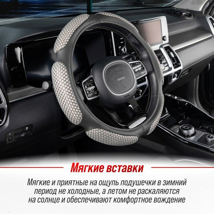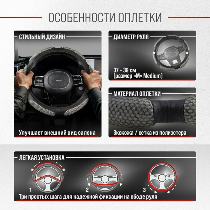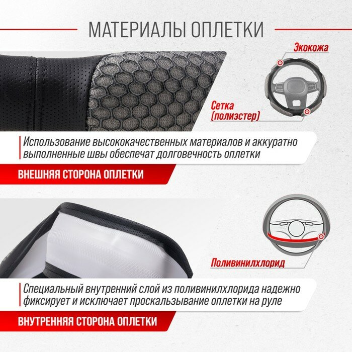 Оплетка на руль - сверхпопулярный автомобильный аксессуар. Сделана из высококачественного материала экокожа с вставками. Практичный черный цвет отлично вписывается в любой интерьер. Стильный дизайн выгодно подчеркнет хороший вкус автовладельца и его индивидуальность. Оплетка на руль Sponge snood размера «M» подходит на 90% отечественных и зарубежных автомобилей. Чехол на руль автомобиля подойдет для Тойота, Гранта, Ларгус, Приора и многих других. На руль оплетка устанавливается легко, не требует долгих манипуляций, достаточно минимума усилий и предварительного нагрева для более легкого надевания. Поэтому справится даже хрупкая девушка.Внимание! Важно ознакомиться с последовательностью натягивания оплетки (см. слайд). Нагреть оплетку можно обычным феном, на солнце или горячим воздухом в машине.Тянется при установке, при этом отлично держит форму и плотно прилегает к рулю, повторяя его рельеф и изгибы. Вот почему чехол на руль автомобиля универсальный. Преимущества: износостойкая, без запаха, устойчива к царапинам и порезам.Чехол на руль с отменными рабочими характеристиками: скрывает имеющиеся потертости и царапины, уберегает от появления новых. Оплетка на руль не перегревается летом от солнечных лучей и не обжигает руки, а зимой не дубеет на морозе, не растрескивается, материал оплетки очень приятный на ощупь.За счет красивого внешнего вида чехол на руль автомобиля хорош как подарок девушке, как подарок мужчине в машину.Противоскользящий материал ПВХ с внутренней стороны гарантирует - оплетка не будет смещаться по ободу колеса, обеспечит крепкое сцепление с его поверхностью, что критично важно во время вращения руля.