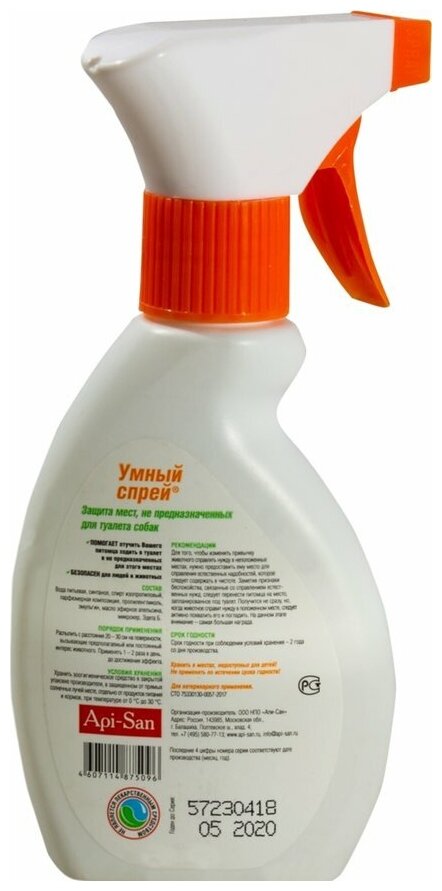 Действие зоогигиенического средства Апи-Сан "Умный спрей" основано на способности эфирного масла апельсина отпугивать животных, раздражать определённые рецепторы языка, вызывая чувство жжения, что позволяет выработать у животных условный рефлекс, связанный с избеганием определенных мест и, таким образом, помогает отучить их ходить в туалет в не предназначенных для этого местах. Входящая в состав средства парфюмерная композиция быстро и эффективно нейтрализует широкий спектр неприятных запахов и обеспечивает длительную свежесть. Применение: Распылить с расстояния 20-30 см на поверхности, вызывающие предполагаемый или постоянный интерес животного. Применять 1-2 раза в день, до достижения эффекта. Для того чтобы изменить привычку животного справлять нужду в неположенных местах, нужно предоставить ему место для справления естественных надобностей, которое следует содержать в чистоте. Заметив признаки беспокойства, связанные со справлением естественных нужд, следует перенести питомца на место, запланированное под туалет. Получится не сразу, но, когда животное справит нужду в положенном месте, следует активно похвалить его и погладить. На данном этапе внимание - самая большая награда. Хранение: Хранят зоогигиеническое средство в закрытой упаковке производителя, в защищенном от прямых солнечных лучей месте, отдельно от пищевых продуктов и кормов, при температуре от 0°С до 30°С. Срок годности при соблюдении условий хранения – 2 года со дня производства. По истечении срока годности зоогигиеническое средство не должно применяться.