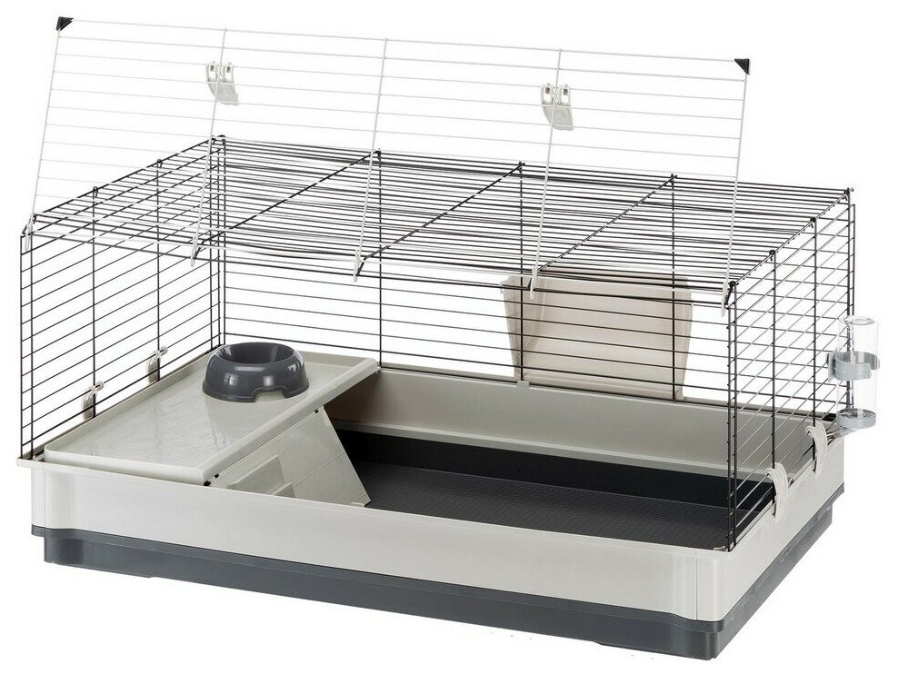KROLIK - линия клеток для кроликов, отличительной чертой которых является то, что и поддон, и металлическая решетка полностью разбираются. Клетка продается в компактной упаковке, что уменьшает затраты при транспортировке, но в то же время в собранном виде клетка очень просторная. Клетка Кrolik выпускается двух цветов и двух размеров. Все модели легко чистить, благодаря открывающейся передней дверке. И большие, и маленькие модели оснащены двумя дверками. В комплекте вы найдете все необходимые аксессуары, среди которых пластиковый домик с миской, панель со ступеньками, кормушка для сена и поилка. Клетку Krolik очень легко собирать, решетки крепятся к поддону с помощью фиксаторов.