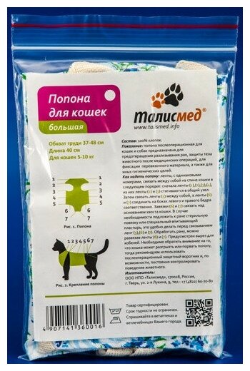 ОписаниеПослеоперационная попона для животных способствует быстрому заживлению послеоперационных ран, является защитой от разлизывания раны животным и препятствует загрязнению шва.Крепится на шее, на спине и за хвостом с помощью завязок, которые обеспечивают надежное крепление.Состав - Послеоперационная попона для кошек и собак состоит из высококачественного и экологически чистого нетканого материала, который широко используется в медицине. - Прочный, устойчивый на разрыв - в случае если животное ведет себя не спокойно и пытается сорвать с себя попону испытания показали, что вероятность этого сведена к минимуму. - Воздухопроницаемый - пропускает воздух, что создает благоприятную среду и не позволяет ране мокнуть. - Не натирает в местах постойного контакта материала с кожей животного. - Долговечный, экологически чистый, легко чистится и стирается, биологически нейтрален. - Безворсовая структура - не расслаивается и не оставляет ворсинок, что позволяет без проблем вырезать жмущие места у животных с нестандартными пропорциями.