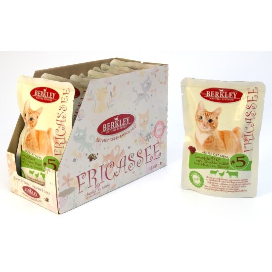 - Обзор влажного корма Berkley Fricasse для кошек с ягненком и говядиной с кусочками курицы