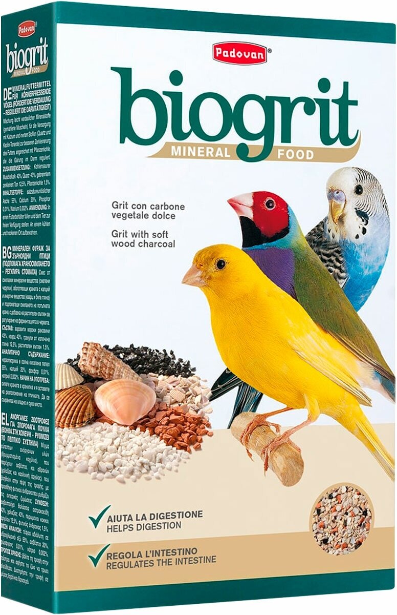 Минеральная добавка для зерноядных птиц (способствует пищеварению - регулирует работу кишечника). Смесь усвояемых минеральных веществ (измельченных ракушек), которые придают кальций, и наполнителей (кварц и каолиновая глина) способствует пищеварению принятой пищи. Добавка древесного угля регулирует ферментацию в кишечнике.