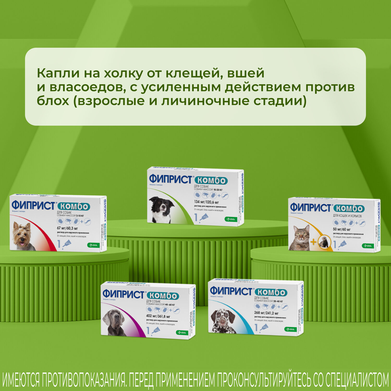 Раствор для наружного применения (капли на холку) Фипронил 134 мг, S-метопрен 120,6 мг Фиприст Комбо для собак живой массой от 10 кг до 20 кг предназначен для профилактики энтомозов, вызываемых блохами, вшами и власоедами; акарозов, вызываемых иксодовыми клещами; в комплексной терапии аллергического дерматита, вызываемого блохами, а также для предотвращения прикрепления и развития эктопаразитов на животных.