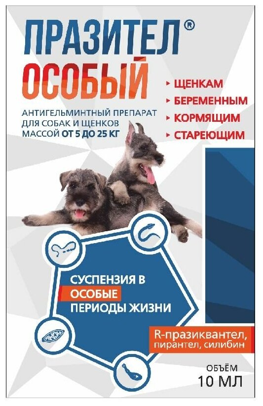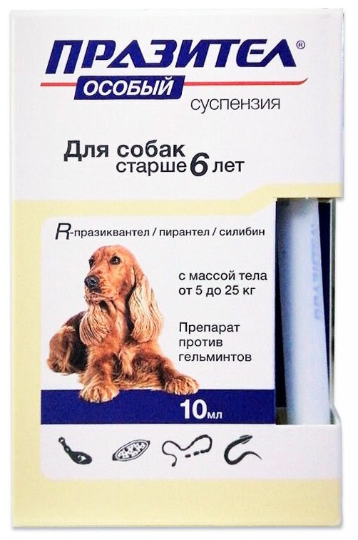 Празител Особый для собак от 5 до 25 кг – уникальный антигельминтный препарат широкого спектра действия для собак старше 6 лет в форме суспензии. Препарат оказывает минимальное негативное воздействие на печень и ЖКТ пожилых собак. Предназначен для лечения и профилактики заражения основными видами круглых и ленточных глистов. В качестве действующих веществ в своем составе содержит R-празиквантел и Пирантела памоат. Назначение: для дегельминтизации собак старше 6 лет при нематодозах и цестодозах.