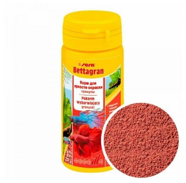Sera BETTAGRAN – легко усваиваемый корм для яркости окраски, состоящий из мелких гранул, произведенных путем бережной обработки сырья; предназначен для всех видов рыб, кормящихся в средних слоях воды, в том числе великолепных бойцовых рыб (петушков).