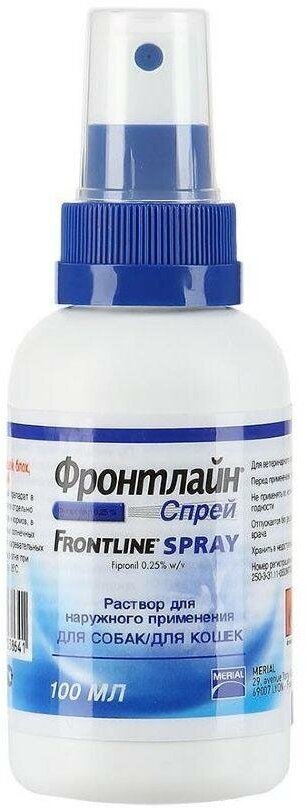 Frontline Spray обладает выраженным действием против вшей, блох, власоедов и иксодовых клещей на всех стадиях развития. При нанесении Frontline Spray на кожно-волосяной покров препарат практически не всасывается через кожу, накапливается в эпидермисе и сальных железах животного, оказывает контактное действие на паразитов. Frontline Spray дает защиту: от насекомых в течении 2-х месяцев, от клещей - в течении 1 месяца после однократного применения. Спрей малотоксичен для животных. Frontline Spray хорошо переносится собаками и кошками. Препарат можно использовать для котят и для щенков с первых дней жизни. Frontline Spray удобен в применении.