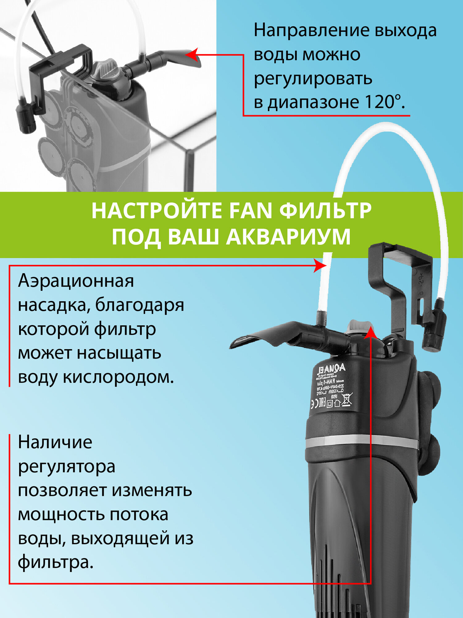 Фильтр внутренний AQUAEL FAN FILTER 1 plus для аквариума 60-100л (320л/ч, 4.7Вт) - это самый популярный в использовании фильтр, предназначен для очищения воды в пресноводном аквариуме и аэрации (насыщения ее кислородом). Аквариумный фильтр «Акваэль фан 1 плюс» можно использовать в различных аквариумах от 60 до 100 литров, в террариумных бассейнах, акватерририумах, паллюдариумах. Внутренний фильтраэратор практически бесшумный, прост в установке и использовании, подойдет опытным и начинающим аквариумистам. Благодаря своей конструкции, устройство возможно крепить разными способами: на внутреннюю стенку аквариума при помощи держателя с присосками, на Г-образный пластиковый держатель или использовать оба способа одновременно. С помощью креплений присосок фильтр можно крепить как на боковую стенку, так и на дно аквариума, поэтому его можно использовать в аквариумах с различными обитателями: пресноводные рыбы, черепахи, креветки и тд. Важно, для корректной работы фильтра, он должен быть полностью погружен в воду, на 3-4 см от поверхности. Фильтр оснащен регулятором производительности, который находится в верхней части прибора, что позволяет снижать или увеличивать мощность выходящего потока, в зависимости от объема аквариума, плотности заселения рыбами, заселение особых видов рыб и загрязнения фильтра. Максимальная производительность 320 л/ч. Направление движения воды можно регулировать в диапазоне 75°. Функция очищения и фильтрация воды производится за счет крупнопористой поролоновой губки и пластикового префильтра. Губка осуществляет биологическую (впоследствии эксплуатации на губке заселяются бактерии, которые перерабатывают токсичные для обитателей соединения аммиака в безопасные нитраты) и механическую (не пропускает крупные и мелкие частицы корма и отходов жизнедеятельности обитателей аквариума) очистку. Пластиковый префильтр служит барьером для более крупных частиц загрязнения. Для качественной очистки и аэрации воды в аквариуме внутренний фильтр должен работать постоянно, не рекомендуется его отключать в ночное время. Температура воды в аквариуме не должна превышать 35 градусов. Фильтр изготовлен с самой высокой степенью защиты от проникновения пыли и влаги IPX8 при соблюдении всех рекомендаций по безопасность для обитателей аквариума. Имеет длину шнура 150 см, что позволяет разместить фильтр и установить аквариум в удобное и безопасное место. Подключается к сети с напряжением 220-240В / 50Гц. AQUAEL более 30 лет занимается аквариумистикой, производит необходимые зоотовары для создания экологичных условий для обитания рыб. животных и растений в аквариумах, садовых прудах и для ухода за ними. Страна изготовления: Польша. Размеры: (длина, ширина, высота) 6,5х5х20 см; длина с присосками 8 см. Цвет: черный. Совместимость: совместим со стерилизатором AQUAEL MINI UV LED для внутренних фильтров. Можно подключить насадку для разбивания потока выходящей воды «флейта» (дождевалка, аквариумный дождь). Не подходит для морского аквариума.