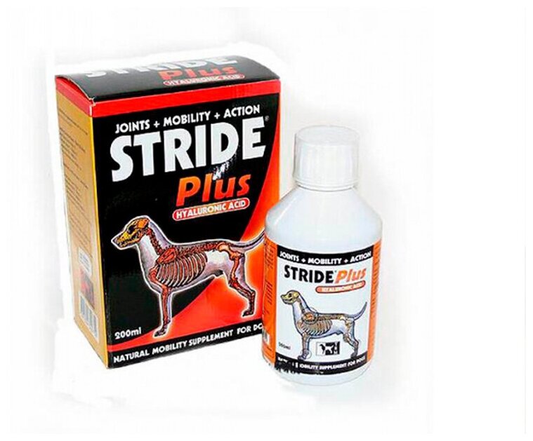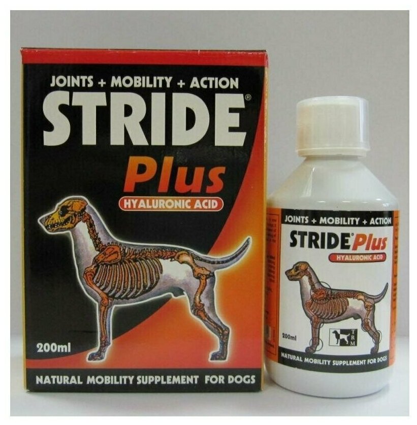 Страйд Плюс представляет собой комплексный препарат, содержащий в 1 мл в качестве действующих веществ 169 мг глюкозамина гидрохлорида, 101 мг метилсульфанилметана (МСМ), 33 мг хондроитина сульфата, 7,2 мг марганца аскорбата, 745 мкг гиалуроновой кислоты и наполнитель до 1 мл. Выпускают в форме раствора для применения внутрь. Расфасовывают в пластиковые флаконы по 200 мл и 500 мл, которые упаковывают вместе с дозатором в картонные коробки.