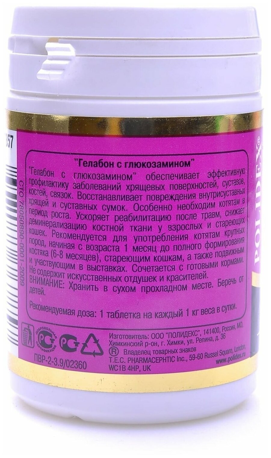 | Состав | Полидекс Гелабон с глюкозамином в 1 таблетке содержит витамин A — 60 МЕ, витамин D — 1,5 МЕ, витамин E — 1 мг, кальций — 10 мг, фосфор — 10 мг, магний — 1 мг, марганец — 1 мг, гидролизат коллагена — 80 мг, таурин — 4 мг, дериват с ТГОС — 3 мг, МСМ — 10 мг, глюкозамин — 30 мг, хондроитин — 15 мг. |