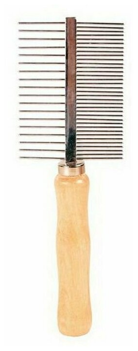 TRIXIE Расческа двусторонняя с деревянной ручкойУход за шерстью собаки предусматривает регулярное расчесывание шерсти и вычесывание выпавших волосков шерсти и подшерстка, особенно в период линьки. Расческа TRIXIE, с удобной деревянной ручкой и металлическими зубцами двух видов: средней густоты и редкие, позволит деликатно ухаживать за шерстью Вашего питомца, не травмируя кожу. а закругленные кончики зубьев оказывают массажный эффект на кожу животного. Зубья расчески, хорошо расчесывают шерсть животного, не причиняют боль животному, поэтому ее рекомендуется использовать часто и без боязни навредить здоровью животного. Она полностью безопасна.Расческа TRIXIE с металлическими зубьями хорошо расчесывают шерсть собак, которые имею длинную шерсть, поэтому они так необходимы для владельцев животных.