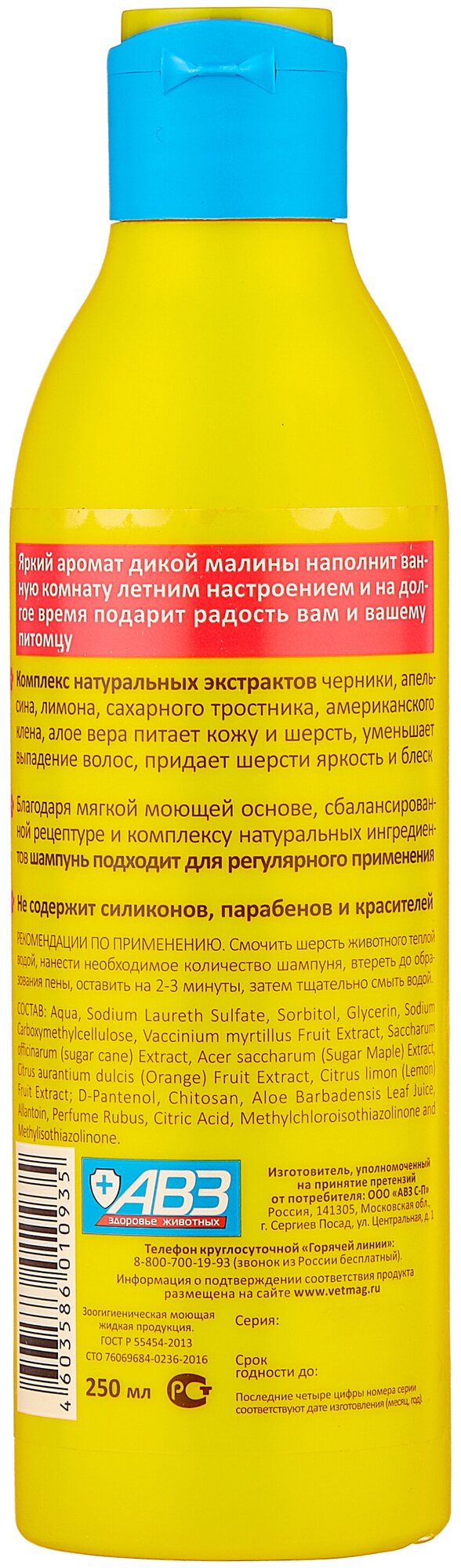 Преимущества: • Не содержат силиконов, парабенов и красителей • Уcтpaняют cпeцифичecкий зaпax живoтнoгo • Уменьшают выпадение волос • Придают шерсти блеск Состав и свойства. В линейку входят 4 средства с разными ароматами. Благодаря сбалансированной рецептуре, мягкой моющей основе и комплексу природных компонентов средства подходят для регулярного применения. В состав шампуней входят натуральные экстракты сахарного тростника, апельсина, черники, американского клена, лимона и алоэ вера. Благодаря этим полезным элементам шампуни снижают выпадение волос, питают кожу и шерсть вашего любимца, придают ей яркость и блеск. Вы можете выбрать один из потрясающих ароматов или попробовать каждый из них. Дикая малина. Яркий аромат дикой малины наполнит ванную комнату летним настроением и на долгое время подарит радость вам и вашему питомцу! Порядок применения. Смочить шерсть животного теплой водой, нанести необходимое количество шампуня, втереть до образования пены, оставить на 2-3 минуты, затем тщательно смыть водой.