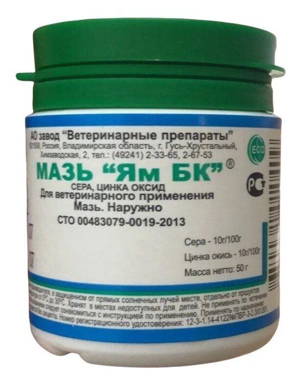 Мазь Ям БК применяют для лечения животных при экземе,дерматитах, вызванных саркоптоидными и псороптоидными клещами, а также трихофитии.Мазь «Ям БК»® обладает акарицидной и фунгицидной активностью. Входящие в состав мази компоненты обладают антисептическими, кератолитическими, вяжущими свойствами, что способствует быстрейшему выздоровлению.