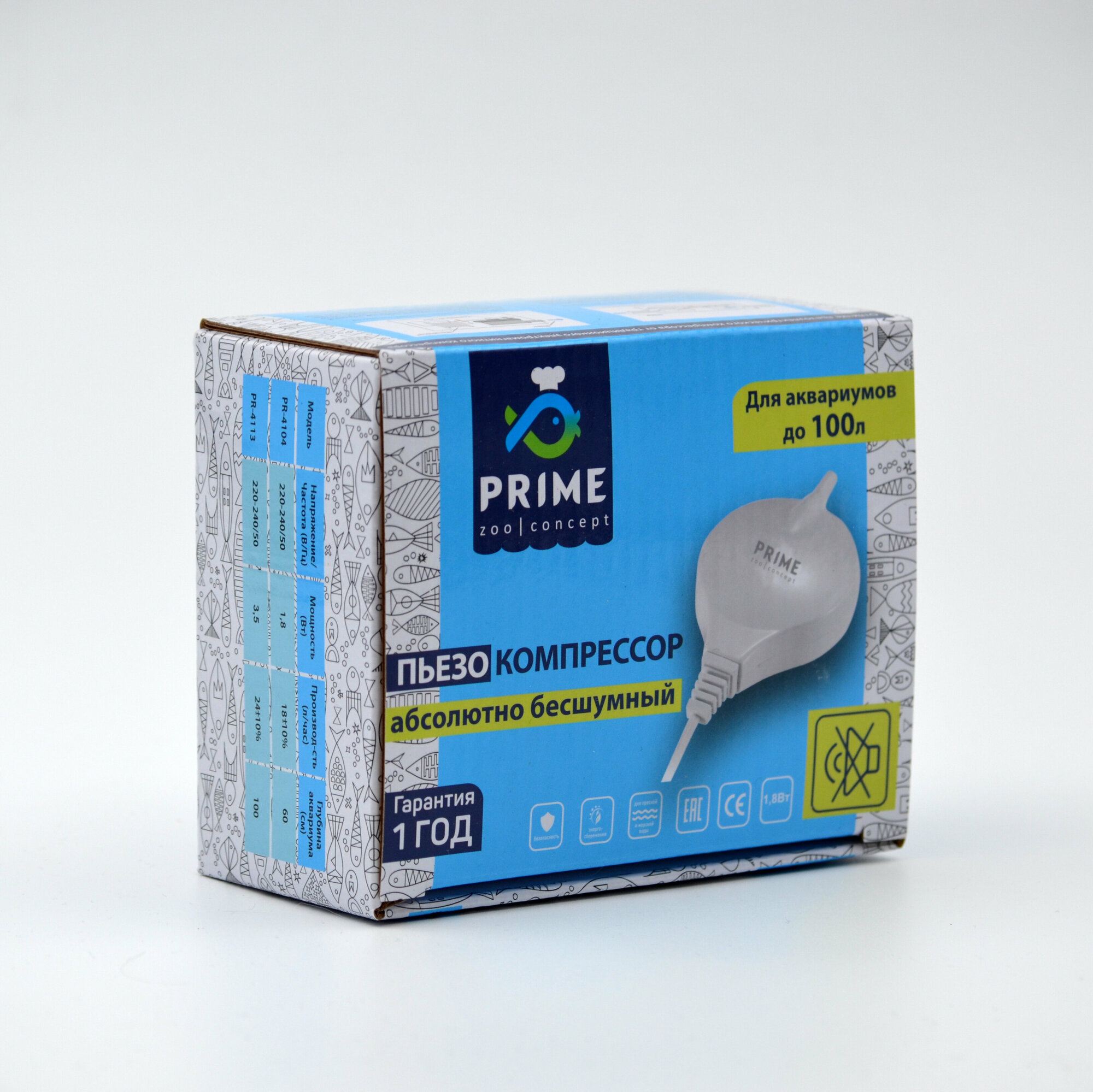 Одноканальный, для аквариумов до 80 л, самый тихий компрессор!На сегодняшний день пьезокомпрессоры являются самыми маленьким и бесшумными аквариумными компрессорами. Применение технологии с использованием пьезоэлектрической мембраны позволило добиться небывало низкого уровня шума — менее 33 дБ. Компрессор настолько миниатюрен, что может быть закреплен с помощью имеющейся на нем присоски на стеклянной стенке снаружи аквариума. Давление воздушного потока, создаваемое компрессором Prime PR-4104, позволяет использовать его для аквариумов с высотой водного столба до 60 см. По данным производителя компрессор может применяться в аквариумах до 80 литров. В комплекте с компрессором поставляется керамический распылитель и силиконовый шланг длиной 1 м. Для размещения в тумбе аквариума имеющегося шланга будет мало, поэтому не забудьте докупить шланг (обычно трех метров хватает для установки компрессора в тумбе). Так же обязательно приобретите обратный клапан для возможности установки компрессора ниже уровня воды аквариума.Параметры:Производительность 18 л/ч, мощность 1,8 ватт, одноканальный. Для аквариумов с высотой водного столба до 60 см и объемом до 80 л (по данным производителя).Комплектация:Пьезокомпрессор, присоска, распылитель, воздушный шланг 1 метр, кабель питания длиной 1 метр, инструкция.