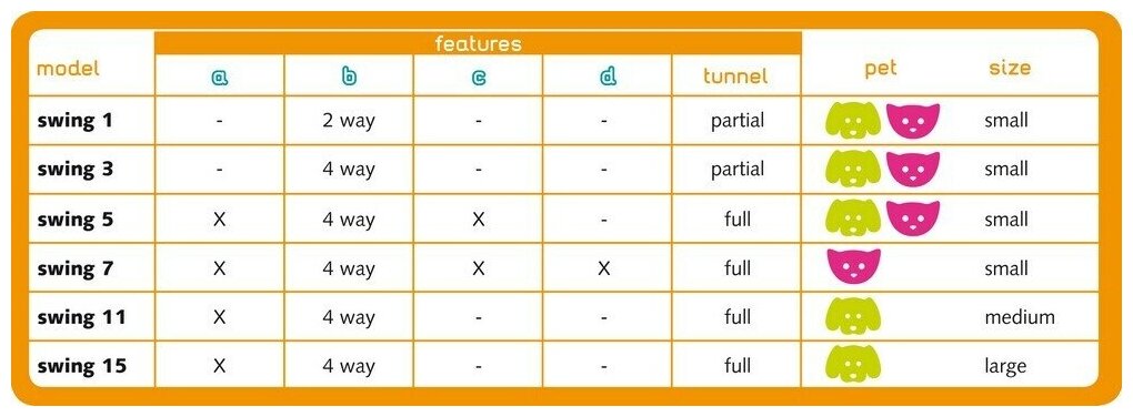 Для кошек и щенков мы рекомендуем модели Swing 1, 3, 5, 7 (с магнитным замком) и Swing Microchip. Для средних и больших собак, а также для крупных кошек наиболее подходящими будут модели Swing 9, Microchip Large, 11, 15.