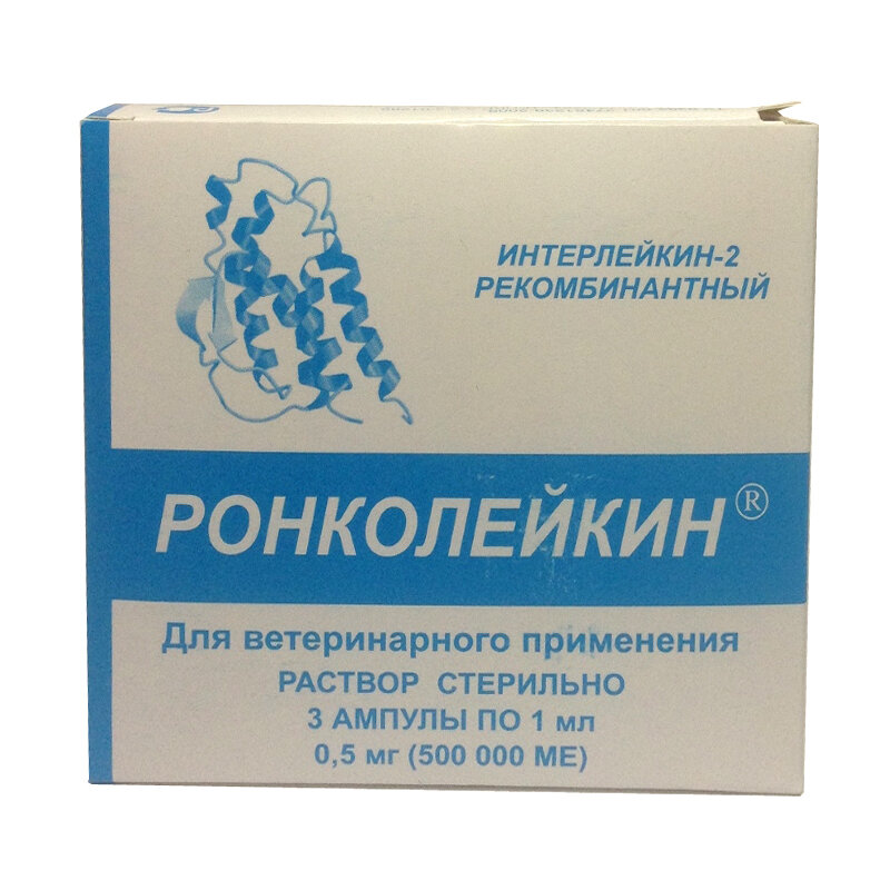 ДОМАШНИЕ ЖИВОТНЫЕ И ПУШНЫЕ ЗВЕРИ: Препарат применяют внутривенно или подкожно с интервалом 24-48 часов. Средний курс лечения составляет 2-3 инъекции из расчета 10000 МЕ/кг. В случае лечения онкологических заболеваний 5 инъекций из расчета 15000 МЕ/кг, через месяц необходимо повторить курс, применять совместно с оперативным вмешательством для предотвращения метастазирования и возникновения вторичных иммунодефицитов, приводящих к возникновению постоперационных осложнений. Ронколейкин также необходимо применять во время или после прохождения химио- и лучевой терапии. Препарат вводится в/в или п/к из расчёта 10000-15000 МЕ/кг 1 раз в сутки. Курс лечения до 5 инъекций с интервалом 24-48 ч. Через 30 дней рекомендуется провести повторный курс. При использовании Ронколейкина как адъюванта вакцин и как снятия стресса при различных манипуляциях, транспортировке, рекомендуется использовать дозу 5000 МЕ/кг однократно. При кожных заболеваниях 3-5 инъекций из расчета 10000 МЕ/кг. Для профилактики вирусных, бактериальных и грибковых заболеваний препарат вводят подкожно из расчета 5000 МЕ/кг массы тела 1-2 инъекции с интервалом 48 часов. Профилактику проводят 2 раза в год с интервалом 6 месяцев. При заболеваниях мочевыделительной системы препарат рекомендуется использовать в комплексной терапии по 2-3 инъекции в дозе 10000 МЕ/кг с интервалом 24 часа. В случае несвоевременного начала лечения курс необходимо увеличить до пяти инъекций. В случае циститов, мочекаменной болезни препарат можно вводить интерцистиально (внутрипузырно). При поликистозе почек у кошек рекомендуется использовать в комплексной терапии по 5 инъекций в дозе 20000 МЕ/кг с интервалом 48 часов. Курс повторить через 30 дней после последней инъекции. Ронколейкин также применяют для подготовки животных к выставкам. Рекомендуется использовать дозу 5000 МЕ/кг двукратно с интервалом 24-48 часов. Последняя инъекция не позднее, чем за 48 часов до предполагаемого начала выставки. Ронколейкин необходимо назначать как поддерживающую терапию для старых и ослабленных животных. Раз в квартал 1-2 инъекции из расчета 5000-10000 МЕ /кг. Для стимуляции врождённого иммунитета, особенно у щенков и котят со слабым сосательным рефлексом, рекомендуется подкожное или оральное введение в дозе 5000 МЕ/кг одно- или двукратно с интервалом 24 часа.