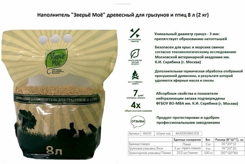 Древесные наполнители для кошек и котят, кроликов, морских свинок, хомяков, крыс и других грызунов "Зверьё Моё" производятся только из специально отобранной, тщательно просушенной, измельченной и спрессованной древесины хвойных пород. В производстве исключено использование топливных гранул. Натуральные, только эко-сырье, впитывают в 3 раза больше собственного веса, запирают запахи, бактерицидные, не пылят, не прилипают к шерсти и лапам, безопасны при попадании в желудок, гипоаллергенны, легко утилизируются в унитаз.