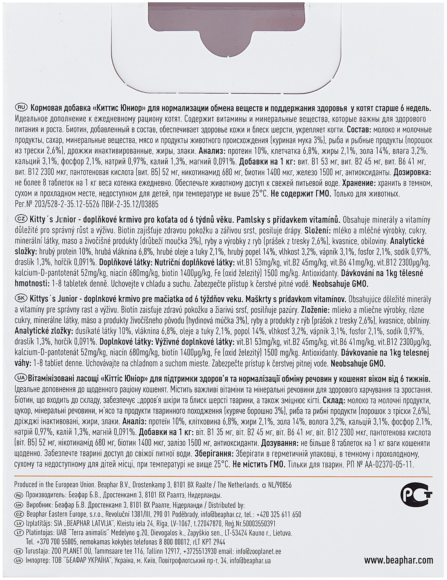 Кормовая добавка Kitty's Junior с биотином для котят идеальное дополнение к каждодневному рациону котят в возрасте от 6 недель. Cодержит все витамины и минералы для здорового развития котят, а биотин обеспечивает здоровую кожу и шерсть котенка. Витамин В1 важен для метаболизма углеводов. Витамин В2 помогает нормальной работе центральной нервной системы и поддерживает здоровье кожи. Витамин B5 нужен для переноса жирных кислот в митохондрии, В6 — для метаболизма аминокислот, сахаров и жирных кислот. Витамин В12 участвует в жировом и углеводном метаболизме, предупреждает анемию и нарушение нейрологических функций. Витамин Н (биотин) способствует здоровью кожи, блестящей шерсти и крепким когтям. Микро- и макроэлементы нужны для нормального функционирования организма (входят в состав тканей, клеток крови, гормонов, ферментов, участвуют в обмене веществ).