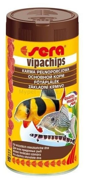 Sera Vipachips - основной корм для всех придонных рыб. Состоит из погружающихся на дно чипсов. Тонущие чипсы быстро размокают в воде, но при этом не теряют форму. Отлично подойдет для пугливых, обитающих ближе к дну рыб, а также ночных рыб.