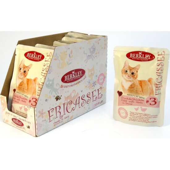 Корм для кошек BERKLEY №3 Фрикасе утка с кусочками курицы и травами в соусе конс. пауч 85г (размер: 0.093)