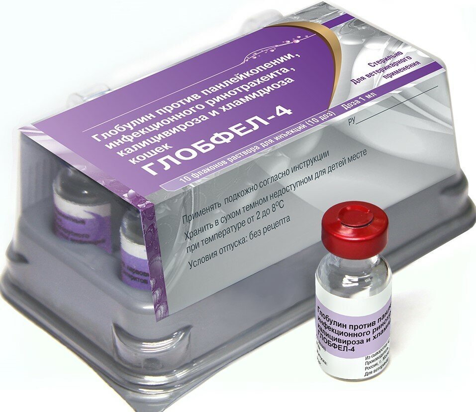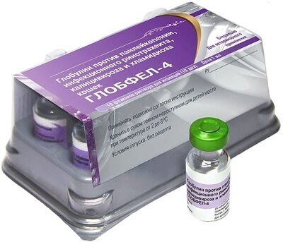 Глобфел-4 — это гамма- и бета-глобулиновые фракции сыворотки крови волов, лошадей или коз, гипериммунизированных антигенами вирусов панлейкопении, инфекционного ринотрахеита, калицивируса и хламидий кошек. По внешнему виду представляет собой бесцветную или слегка желтоватую, прозрачную или опалесцирующую жидкость с незначительным осадком на дне. Глобулин выпускают во флаконах по 1мл — 1доза.