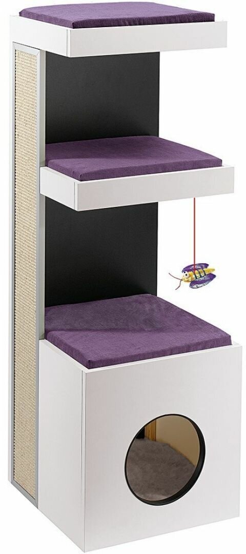 Четыре этажа для вашего питомца! Tiger - мебель для кошек с когтеточкой и мячиком. Внизу расположено закрытое место для сна с удобной внутренней подушкой. Все подушки домика Tiger отличаются универсальностью, т.к. они двусторонние: зимой кошке будет приятно спать на плюшевой стороне, а летом, наоборот, ее охладит синтетический материал. Сбоку расположена когтеточка из сизаля - натурального материала для затачивания когтей. Tiger - безопасный продукт, разработанный для комфорта и удобства вашей кошки; в то же время это стильный аксессуар, который отлично впишется в интерьер вашего дома и может быть размещен в любом месте по вашему желанию. Подушки на полочках изготовлены из материала, напоминающего вельвет, в винтажном стиле, особенно модном в этом году.