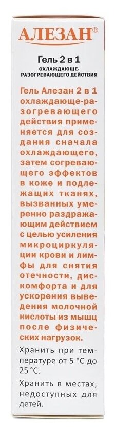 Оригинальная комбинация компонентов геля Alezan сразу после нанесения оказывает охлаждающее действие, затем согревающее и расслабляющее. Гель снимает перенапряжение и усталость мышц, улучшает подвижность в суставах, стимулирует кровообращение, обладает успокаивающим действием.