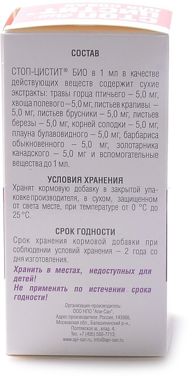 Стоп-цистит Био применяют кошкам и собакам для нормализации и улучшения работы мочевыделительной системы, а также в комплексе с лекарственными препаратами при урологическом синдроме, мочекаменной болезни и в послеоперационный период после удаления мочевых камней. Побочных явлений и осложнений при применении кормовой добавки в соответствии с настоящей инструкцией, как правило, не наблюдается. При повышенной индивидуальной чувствительности животного к компонентам кормовой добавки и появлении аллергических реакций использование кормовой добавки следует прекратить.