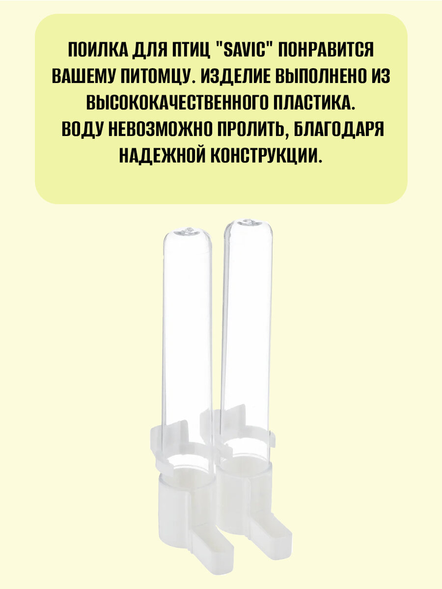 Внешняя поилка для мелких и средних птиц Savic Fountain M (2 шт. в упаковке) вертикального типа позволяет пить воду птицам в любое время суток в нужном количестве. Удобно, безопасно, не загрязняется вода, невозможно пролить воду из поилки. Удобная и практичная универсальная поилка для попугаев, канареек, амадинов с носиком обеспечит комфорт Вашей птице. За счёт прозрачной текстуры поилки можно легко контролировать уровень воды в ней. Автопоилка внешняя в клетку произведена из нетоксичного пластика. Размеры: Диаметр 2,5см, Высота 14,5см.