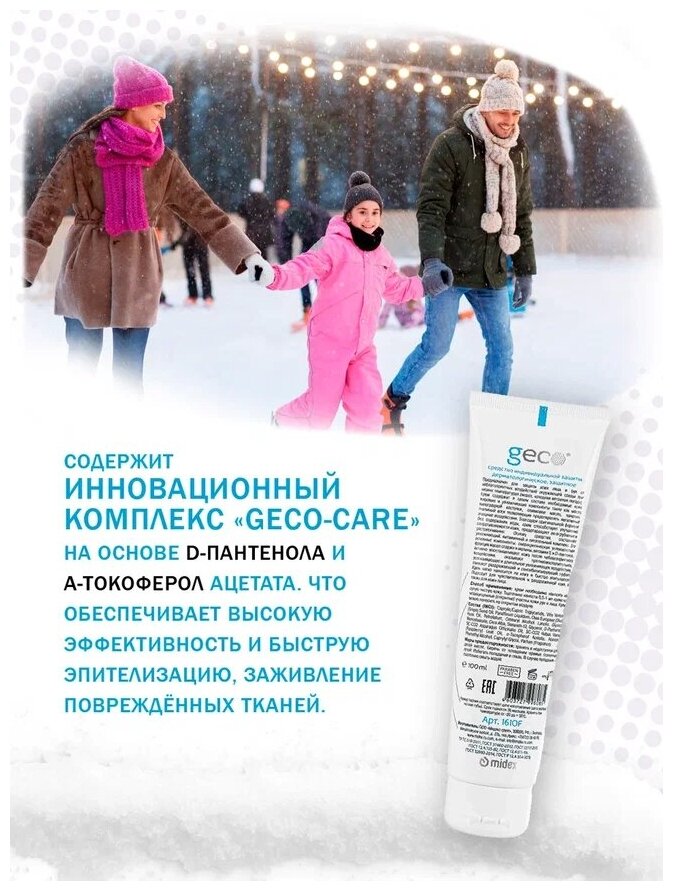 Крем предназначен для эффективной защиты кожи лица и рук от неблагоприятных воздействий окружающей среды (мороз, холодная ветреная погода). В этих условиях разрушается защитная гидролипидная мантия кожи, что может привести к ее раздражению. Крем содержит в своем составе необходимые коже жировые и увлажняющие компоненты, позволяющие предотвратить негативные внешние воздействия. Благодаря оригинальной формуле, крем способствует улучшению сопротивляемости кожи, предотвращает ее огрубление и растрескивание, стимулируя необходимую саморегенерацию. Крем предназначен для защиты кожи лица и рук от мороза, снега, сильного ветра. Предотвращает обветривание и обморожение, создаёт надежный барьер в экстремальных погодных условиях, позволяя коже свободно дышать, а также замедляет потерю влаги, предотвращает ее огрубение и растрескивание. Крем водостоек. Содержит инновационный комплекс «GECO-CARE» на основе d-пантенола и α-токоферол ацетата. Что обеспечивает высокую эффективность и быструю эпителизацию, заживление повреждённых тканей. Снижает раздражающий и сенсибилизирующий эффект, вызванный техногенными и экологическими факторами. Крем хорошо распределяется и впитывается, не вызывая на коже ощущения липкости и жирности. Не содержит парабенов, хлоризотиазолинов, нефтяных производных, красителей и силиконов. Подходит для многократного использования.