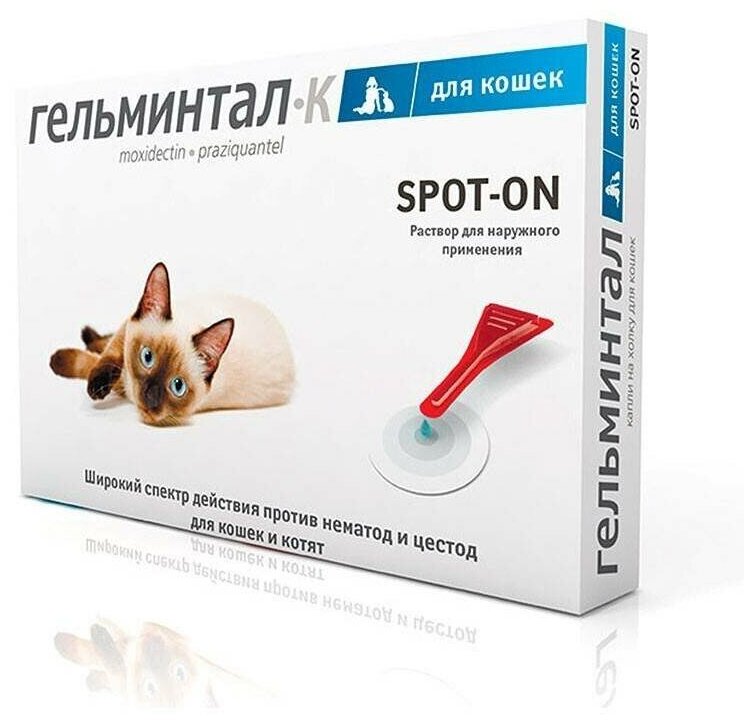 Гельминтал К назначают кошкам с лечебной и профилактической целью при кишечных нематодозах (токсокароз, токсаскаридоз, унцинариоз, анкилостомоз), цестодозах (тениидозы, дипилидиоз, эхинококкозы), энтомозах, вызванных блохами, отодектозе и нотоэдрозе, а также для профилактики дирофиляриоза. Препарат применяют кошкам путем капельного («spot-on») нанесения на сухую неповрежденную кожу.