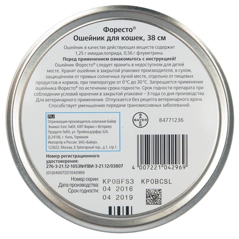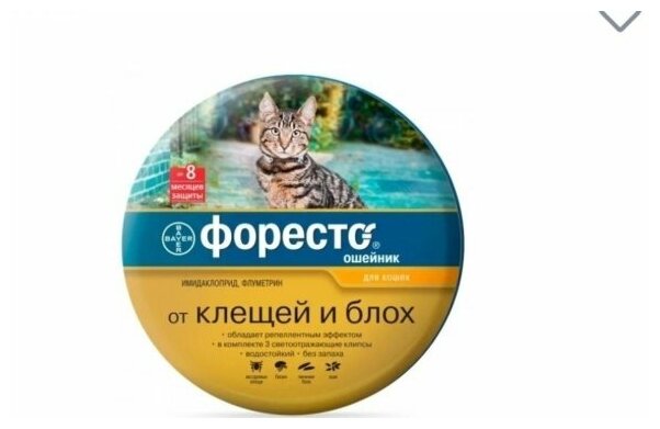 Ошейник Форесто® предназначен для уничтожения иксодовых клещей, блох, вшей и власоедов, паразитирующих на кошках, а также для защиты кошек от их нападения. Непрерывное использование ошейника Форесто® обеспечивает защиту питомца от насекомых и иксодовых клещей на протяжении 8 месяцев.