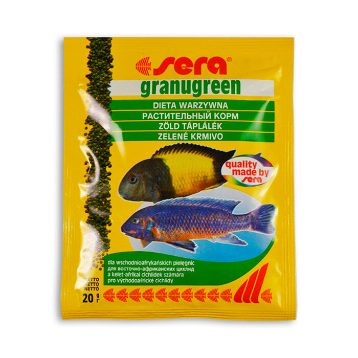 Sera «Granusreen» – это основной корм, состоящий из мягко изготовленных гранул без красителей и консервантов для небольших цихлид, которые в основном питаются растениями и перифитоном. Это многие восточноафриканские виды цихлид. Высококачественные растительные компоненты, такие как водоросли спирулины и шпинат с большим количеством натуральных каротиноидов, способствуют оптимальному развитию цвета. Сбалансированный состав способствует интенсивному развитию и здоровому пищеварению. Медленно тонущие гранулы хорошо сохраняют свою форму и не загрязняют воду.