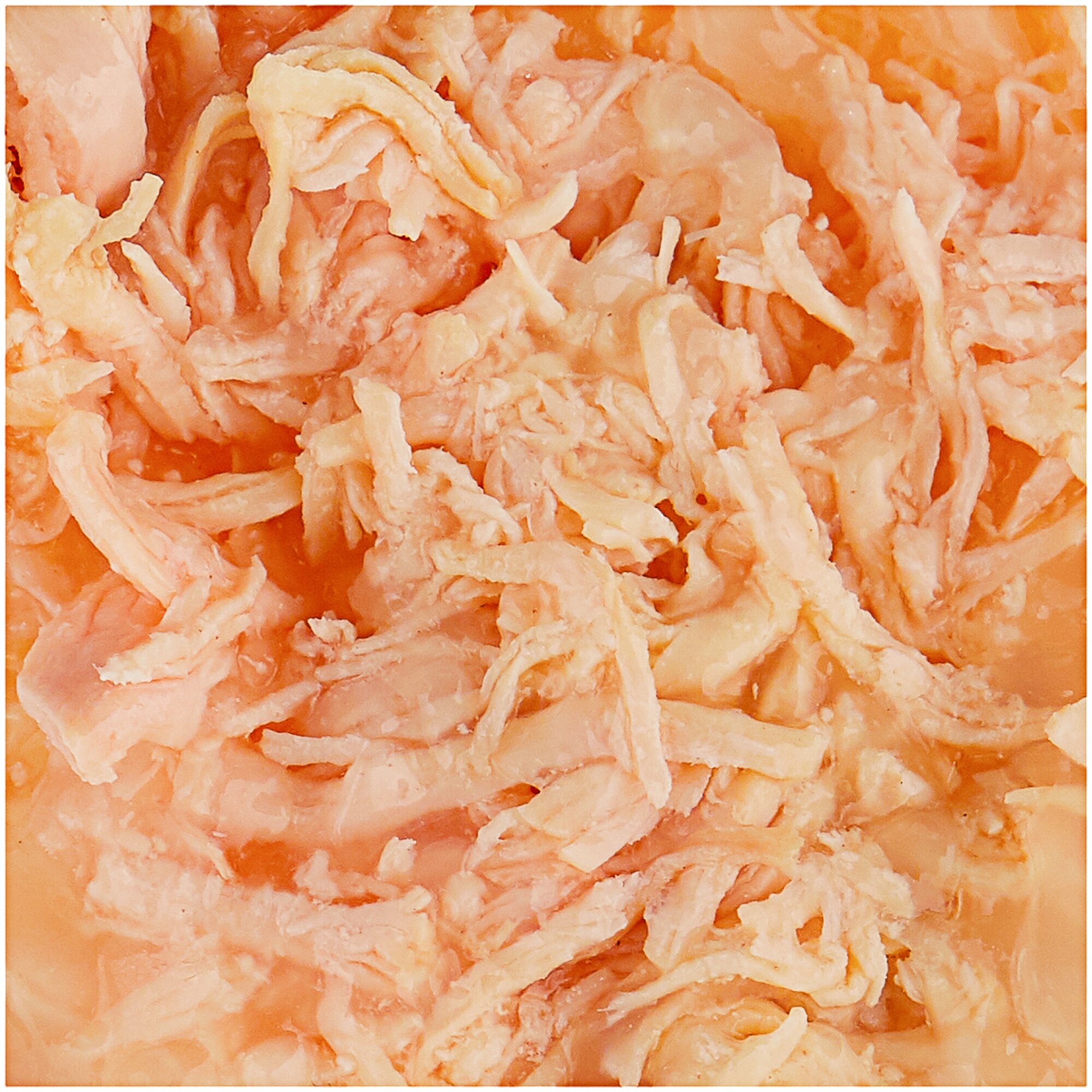 В пауче практически только волокна куриного мяса и кусочки рыбы, выглядит как человеческая еда почти)
