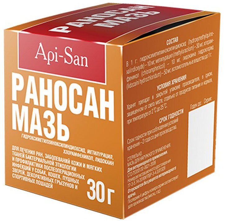 РАНОСАН® мазь, 30 Г Препарат для лечения ран. Раносан мазь применяют собакам, кошкам, пушным зверям, декоративным грызунам и спортивным лошадям наружно для лечения ран различной этиологии, ожогов, пролежней, обморожений, воспалительных заболеваний кожи и мягких тканей, а также для профилактики послеоперационных инфекций (после кастраций, купирования хвостов и ушей, наложения швов). Особенности и преимущества: • Действие на штаммы бактерий, устойчивых к другим химиотерапевтическим средствам. • Широкий спектр антимикробного действия. • Быстрый местно-анестезирующий эффект. • Стимулирование регенеративных процессов в тканях. • Адсорбация раневого экссудата.