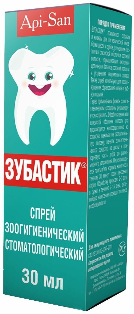 "Зубастик Спрей" применяют для гигиенической обработки ротовой полости, снижения болевого синдрома и улучшения состояния слизистой, устранения неприятного запаха и воспалений при заболеваниях ротовой полости, в том числе стоматитах, альвеолитах, пародонтозах, пародонтитах,заболеваниях десен и для профилактики возникновения зубного камня у кошек и собак.