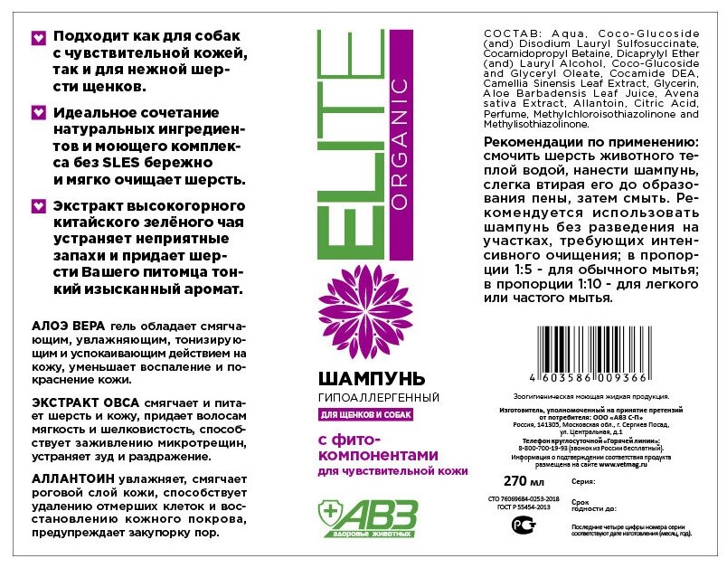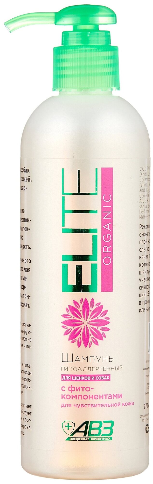 Шампунь для щенков и собак АВЗ Elite Organic гипоаллергенный для чувствительной кожи 270мл