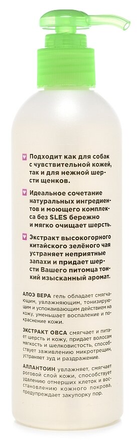 Очень мягкий моющий комплекс бережно очищает шерсть, не нарушая ее структуры, натуральные ингредиенты: Алое Вера, экстракты овса и зеленого чая и аллантоин питают и укрепляют волосы, повышают их прочность, упругость, наполняя шерсть жизненной силой. Экстракт высокогорного китайского зелёного чая устраняет неприятные запахи и придает шерсти Вашего питомца тонкий изысканный аромат. Без SLES.