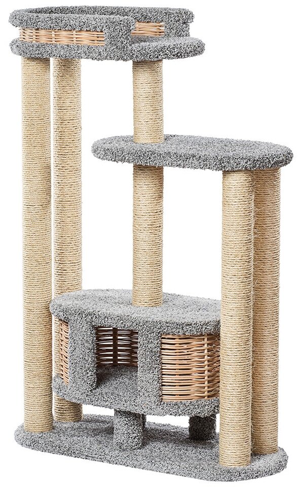 Комплекс для больших кошек "Чаруша" - это модель кошачьего комплекса, которая зарекомендовала себя как отличный тренажер для кошек, место для спокойного отдыха, активных игр и развития. В комплексе предусмотрен просторный домик для кота (размер домика 67*42 см.), промежуточная полочка и удобная лежанка на хорошей высоте (лежанка для кошки в размере 67*42 см.). Главное преимущество комплекса для кошек "Чаруша" - это длинные боковые столбы когтеточки (когтеточка с одной сторону 97 см., с другой стороны - 130 см.). Диаметр столбиков-когтеточек 10 см. Кошка сможет потянуться в полный рост, вскарабкаться по столбам и с наслаждением поточить коготки. В комплексе под каждым элементом предусмотрено по три опоры - это дает максимальную прочность конструкции и делает ее годной для использования кошками крупных пород (рекомендуется для кошек до 10 кг.). Обивка сделана из прочного и мягкого ковролина. Обмотка когтеточек - сизалевый канат.
