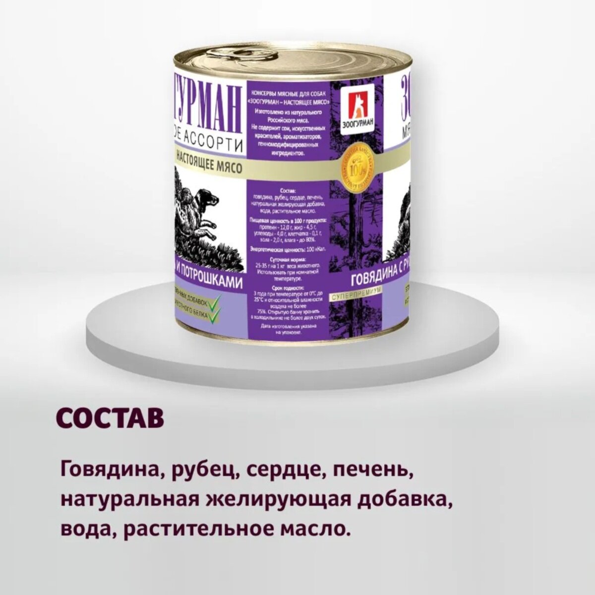 - Состав:говядина, рубец, сердце, печень, натуральная желирующая добавка, вода, растительное масло.
