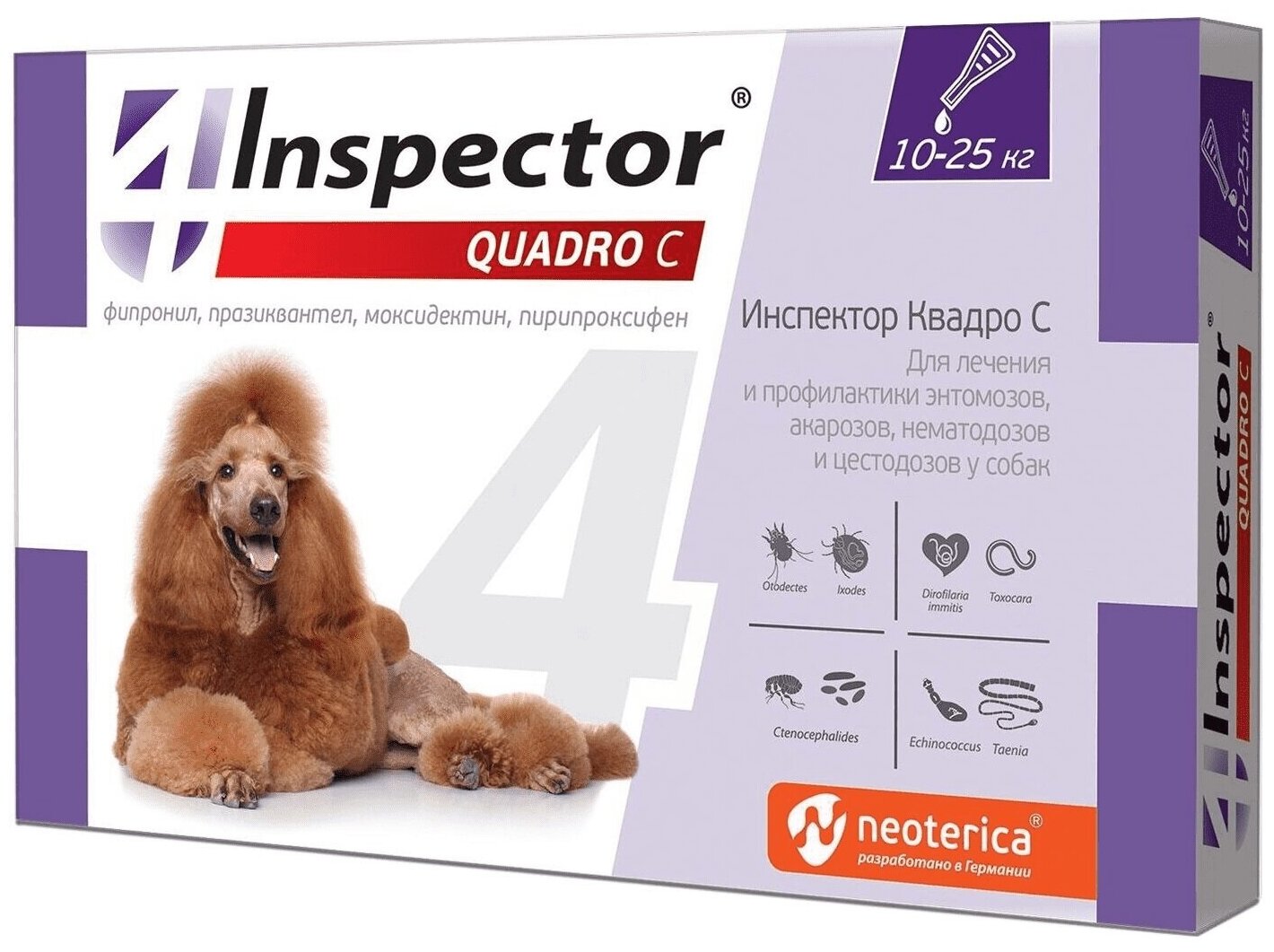 Inspector защищает от 20 видов внешних и внутренних паразитов. Inspector — это инсектоакарицид и антигельминтик.Эффективно защищает от паразитов:- клещей 1 месяц- насекомых 1,5 месяц- гельминтов 1 месяцБезопасен.- Inspector подходит беременным и кормящим самкам.Используйте Inspector:✔ С 7-ми недель✔ С 10 до 25 кг*Обработка щенков пород собак, чувствительных к макроциклическим лактонам (колли, шелти, бобтейл) следует проводить под наблюдением ветеринарного врача** Обработку сук в период беременности и вскармливания приплода при необходимости проводят с осторожностью под наблюдением ветеринарного врача