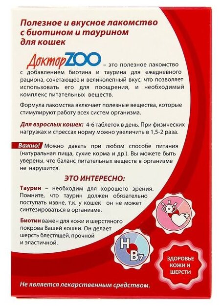 Доктор ЗОО - витамины для кошек Биотин-Таурин "Здоровье кожи и шерсти" - это необходимая добавка к ежедневному питанию Вашей кошки. Важная особенность этого мультивитаминного лакомства -его можно давать при любом способе питания. Вы можете быть уверены, что баланс витаминов в организме не нарушится. Лакомства включает комплекс витаминов и минеральных веществ, которые стимулируют работу всех систем организма.
