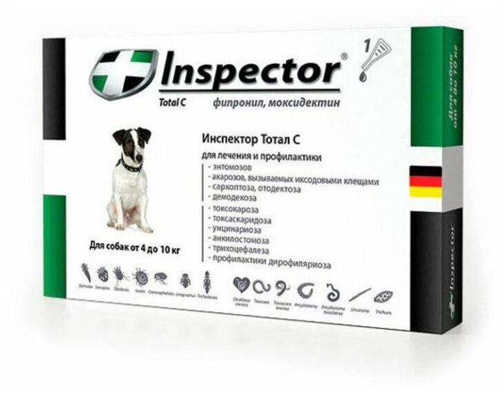 Inspector Quadro инсекто-акарицидные капли от всех паразитов для собак от 4 до 10 кг. Комплексный препарат против 20 видов внешних и внутренних паразитов. Inspector Quadro защищает собак:на 1 месяц от:
