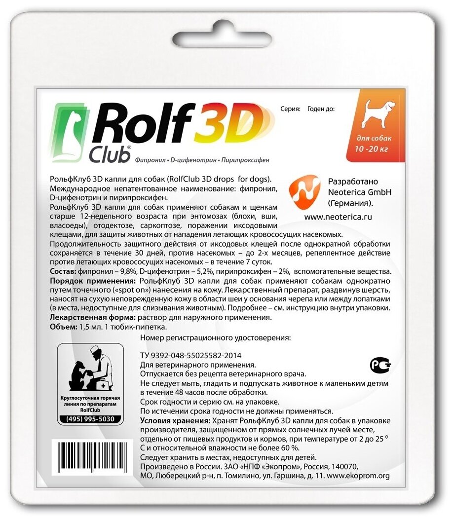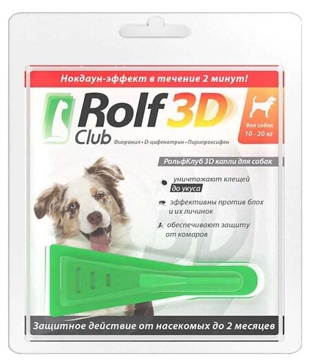 Капли ROLF CLUB 3D R404 для собак 10-20 килограмм от клещей, блох и комаров (размер: 0.1)