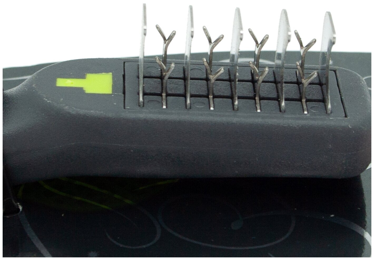 Zolux Колтунорез для собак с 5 зубцами. Аксессуар для собак с вьющейся шерстью – колтунорез с 5 зубцами от Zolux. Зубцы позволяют безболезненно избавиться от небольших колтунов. Размеры оборудования – 35х35х155 мм, цвет – чёрно-зеленый. Особенности колтунореза для собак с 5 зубцами Zolux Модель имеет вертикальный тип расположения кромок, небольшой размер зубцов, что удобно для вычесывания животных даже с сильно вьющейся шерстью. Загнутые края 5-ти лезвий позволяют избежать порезов и повреждений кожи. Прочная крупная головка с расположенным на противоположной стороне колтунореза изгибом и вставкой помогает работать аккуратно, а при необходимости – быстро протягивать лезвия сквозь колтун. Важный момент – наличие небольшой резиновой вставки в ручке под палец с противоскользящими насечками. Оборудование способно работать долгое время, не требует в дальнейшем затачивания острой части зубцов. Плюсы Zolux Компания, работающая с 1933 г, выпускает множество аксессуаров для животных, ежегодно обновляя ассортимент несколькими сотнями новинок. Материалы изготовления: •надежны; •практичны и гигиеничны; •выдерживают даже длительное/профессиональное применение.