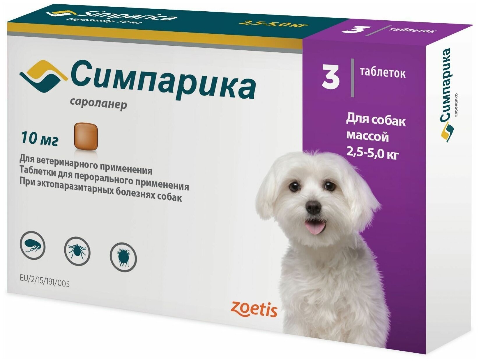 Препарат для собак Zoetis Симпарика весом 2,5-5кг таблетки от блох и клещей 10мг 3таб