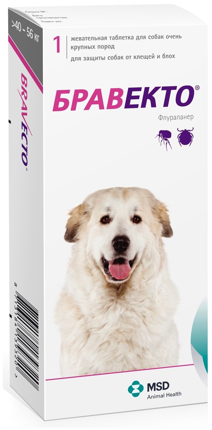 Препарат для собак INTERVET Бравекто от блох и клещей 40-56 килограмм, 1таб на 3мес. 1400мг (размер: 0.058)